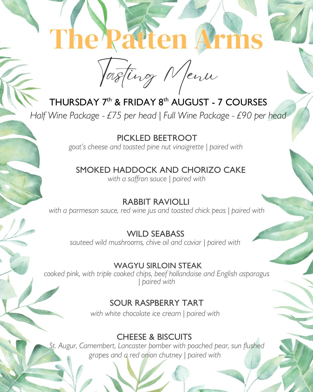 Intimate and Exclusive: Our tasting evenings are set in the cosy and inviting atmosphere of The Patten Arms, offering an intimate dining experience. With limited seating, guests are guaranteed personalized attention and a relaxed environment to savour every moment.